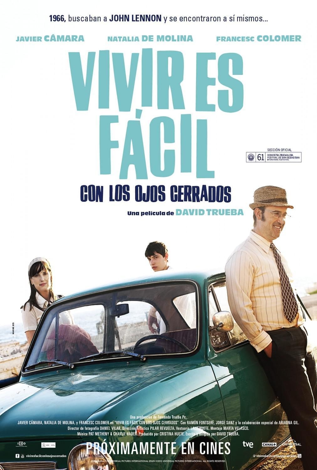 这个根据真实故事改编的影片背景发生在1966年,披头士乐队在西班牙南部城市阿尔梅里亚巡演时。“闭上眼睛活着很容易”是一句歌词,来源于列侬在这次西班牙巡演时谱写的披头士乐队的一首单曲:《Straberry field forever》(草莓园永恒),这部影片也是与他有关的影片,但是讲述的并不是他的故事,而是三位不同经历,不同出身的人想方设法去接近和探访约翰列侬的故事:一个狂热痴迷约翰列侬的奔赴披头士乐队巡演地的西班牙英语老师,一个年仅十六岁离家出走的男孩,一个怀有身孕同样也在逃避着什么的年轻女孩···他们在一起的旅途,会碰撞出什么样的火花和故事?而这部影片与约翰列侬又有着什么样的关系? 2014年西班牙戈雅奖最佳影片、最佳女演员 、最佳原创剧本。